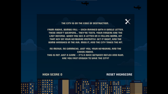 The city is in danger. From the skies above, bombs begin to fall—each one marked with a single letter. They descend with purpose and speed, threatening to destroy everything in their path. But these bombs are not unstoppable. You hold the key to defuse them—literally.